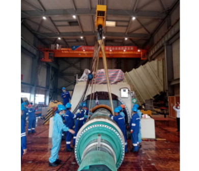 開(kāi)工時(shí),檢修人員先使用行車配合固定住轉(zhuǎn)子兩側(cè),電動(dòng)葫蘆啟動(dòng),緩慢開(kāi)動(dòng)行車配合,平穩(wěn)的將轉(zhuǎn)子護(hù)環(huán)位置從定子膛內(nèi)緩慢移出……整個(gè)過(guò)程中,現(xiàn)場(chǎng)還有專人時(shí)刻注意轉(zhuǎn)子與定子的間隙,防止轉(zhuǎn)子與定子發(fā)生碰磨,每一步的移動(dòng)都要做到配合完美。一道道指令,一聲聲哨響,觸動(dòng)著現(xiàn)場(chǎng)每一位檢修人。終于,經(jīng)過(guò)三個(gè)小時(shí)的奮戰(zhàn),重達(dá)66噸、長(zhǎng)達(dá)12米的轉(zhuǎn)子被成功抽出,并落在指定位置上。