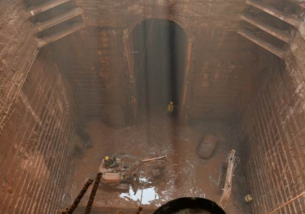進行到后期,隨著豎井深度的不斷加深,材料的轉運難度變大,下井施工人員作業時的安全風險和安全管控也變得更大。施工人員稱,鋼筋只能通過大型機械轉運至豎井通道門口,靠人力一根一根抬進豎井邊,再利用鋼絲繩電動葫蘆下放到施工作業面使用。